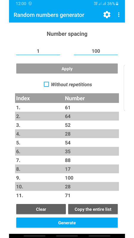 生成されたすべての乱数がリストに追加されます。リストの乱数は番号が付けられ、スマートフォンに保存されます。