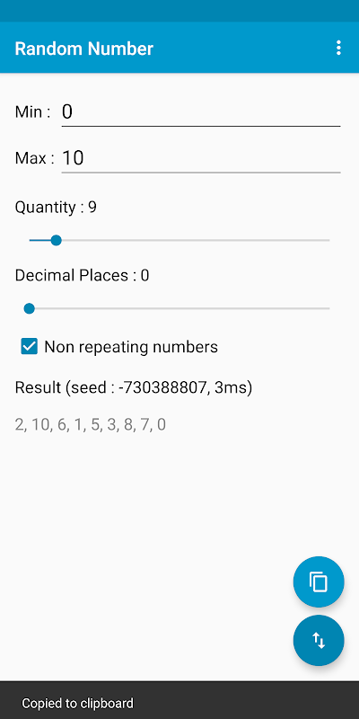 物事の選択を決定するための乱数ジェネレータ。このアプリは、設定可能な間隔で繰り返しのない数字のランダムなセットを生成します。 -999999999999999から9999999999999999までの数値を生成できます。