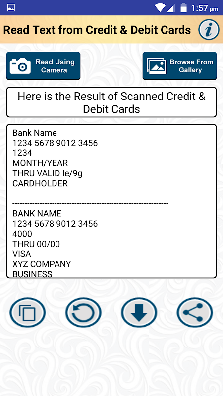 This is a Free Android App to Read & Save Text of Visiting Credit & Debit Cards as well as Picture image OCR Reading of their saved photos in editable format. App Recognizes text of pictures to Convert text written in any image to Editable text format directly by optical character recognition Scan using Camera of your Android Mobile Phone.