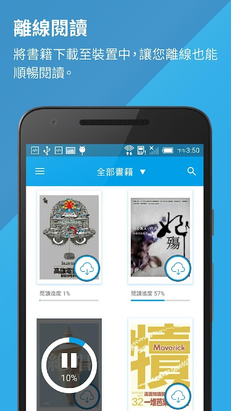 1. 離線閱讀:您可將書籍下載至裝置中,一旦下載完成,無需網路連線也可隨時隨地在您的 Android 手機與平板上順暢閱讀。