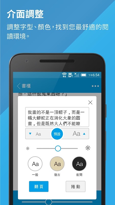5. 切換背景模式:讓您在不同環境下可切換復古、夜間等模式,享受最舒適的閱讀環境。
