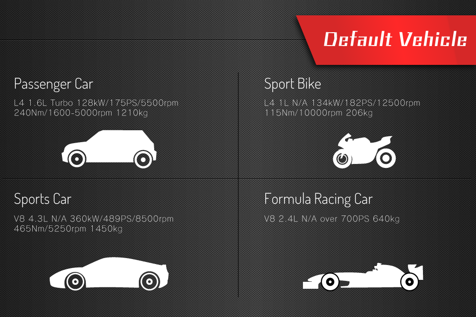 ○乗用車、スポーツカー、スポーツバイク、レーシングカーの4種類。