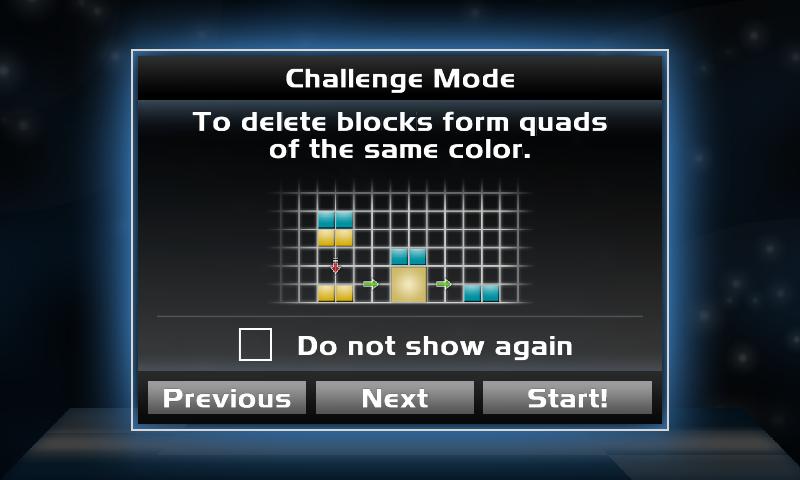 If you only have time for a two-minute-break, try the Time Attack Mode. In Time Attack you have to form as many quads as possible in 90 seconds. So try to place the falling units quickly and discard unsuitable ones on the side.