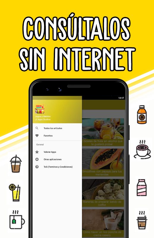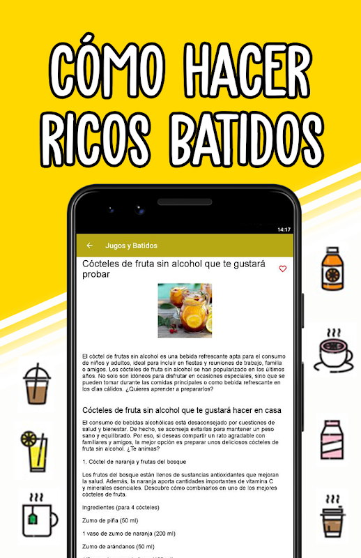 このアプリケーションは、クリックするだけで利用できるシンプルで便利な無料の経済的なレシピ本です。携帯電話に保存して、頻繁にチェックし、最高のスムージー、ジュース、おいしい飲み物を準備できます。私たちはしばしば何かを飲んだり、他の人のために何かを準備したりしますが、材料をどのように準備または組み合わせるかはわかりません。