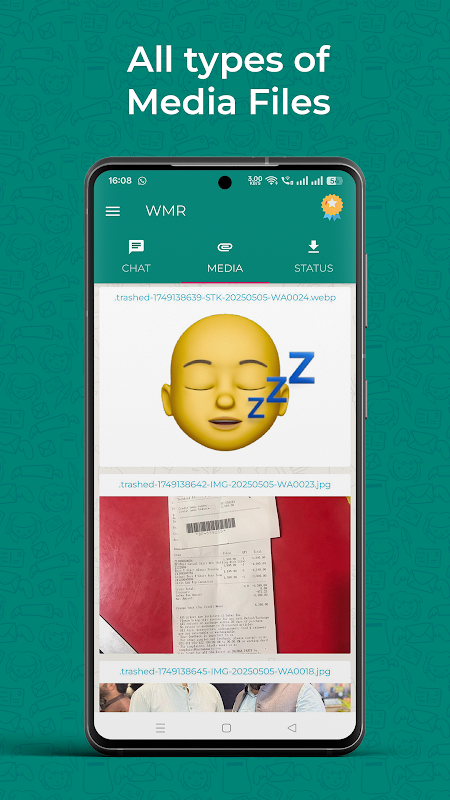 削除されたメッセージの回復: WMR & ステータス セーバーは、あなたが探していた womr ツールです。 このアプリを使用すると、削除されたメッセージと、写真、ビデオ、オーディオ、音声メモ、アニメーション GIF、ステッカーなどのメディア添付ファイルを復元できます。 ステータスの動画や画像もダウンロードできます! すべて 1 つの WhatsRemoved アプリで!