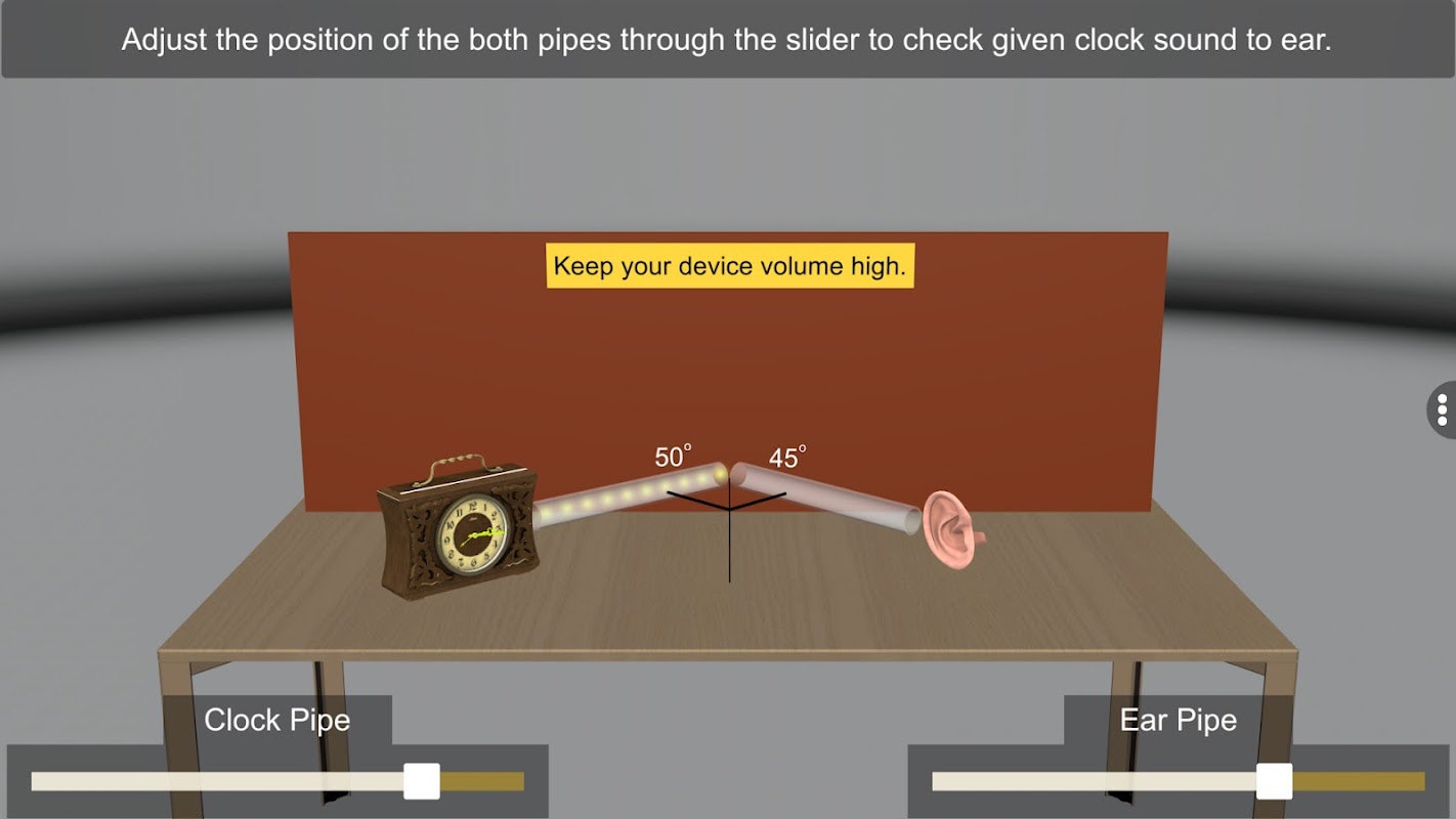 「Reflection of Sound」アプリの機能を見てみましょう。ユーザーはまず、音の反射に使用されるさまざまなガラス製品や装置に慣れます。その後、ユーザーはアプリによってガイドされ、明示的な指示に従ってアクティビティを実行します。この堅牢なアプリケーションは、音の反射の働きについて勉強したり教えたりしたい学生、教育者、教師にとって優れた教育および学習ツールです。