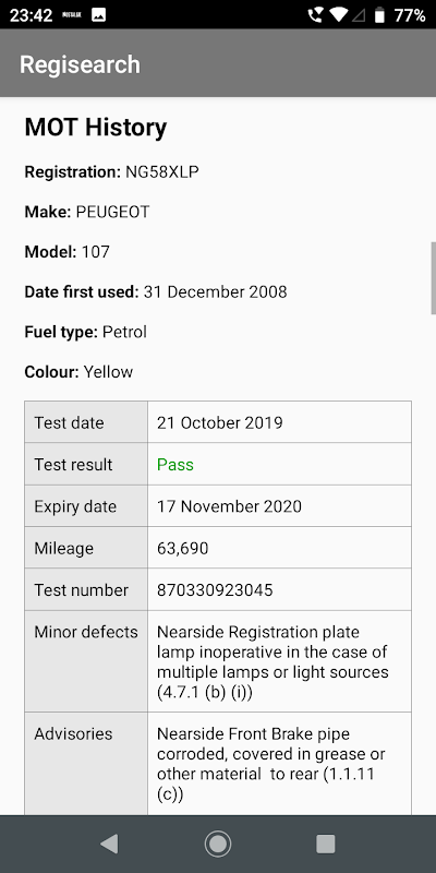 車、バン、自転車、トライク、トラック、バス、登録番号のある車両の車両情報を検索できます。 DVSAサーバーから返されるのはこれだけであるため、MOT履歴は、車、バン、自転車、トライク(クラス1、2、3、4、5、7)についてのみ表示されます。