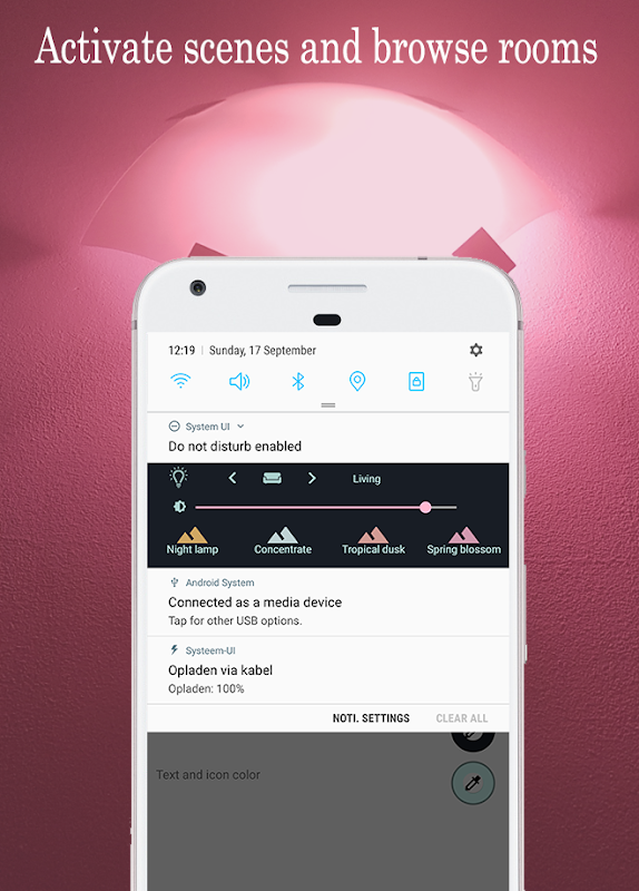 Remotificationで:フィリップス色相は、あなたのフィリップスフエ電球を操作することも簡単です。一度フィリップス色相橋とすべての部屋とのシーンはフエ通知制御で撮影されているアプリを接続します。あなた自身のグループやシーンを作成することも可能です。そして、あなたは通知から制御したい部屋やシーンを選びます。この通知は、あなたが家から離れて行くときに消え、あなたが家に帰るとき、再び表示されます。すべての客室には、シーンや設定は、あなたがしなければならないすべては、同じGoogleアカウントを使用しての上でログインしている、すべてのデバイスに同期されます。
