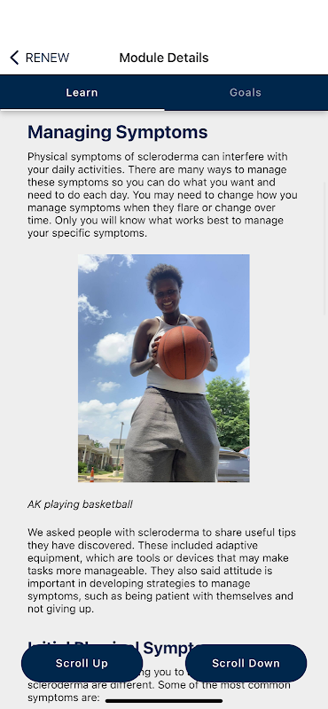 Renew Sclerodermaは、強皮症の人が倦怠感を管理し、健康を増進するのに役立ちます。これには、訓練を受けたピアメンターによる健康指導が含まれます。 Renew Sclerodermaを使用すると、ユーザーは強皮症に関する情報を読んだり、毎週の目標を設定および追跡したり、これらの目標に関連するアクティビティを完了したりできます。