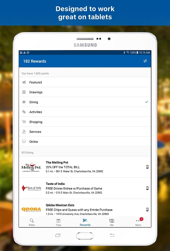 Use the RideShare app to find rideshare matches and earn rewards in the greater Charlottesville, VA area.