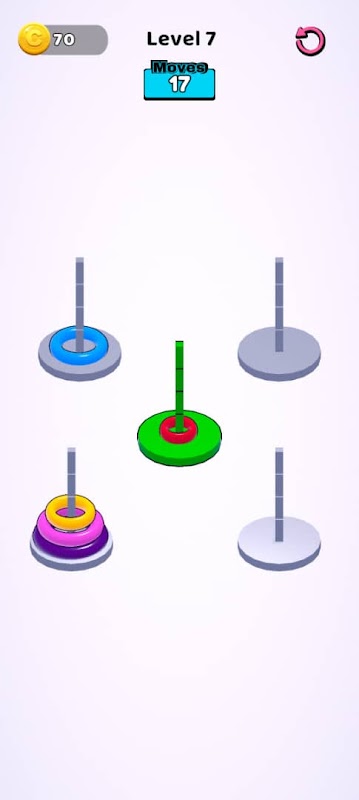 このやりがいのあるパズルの目的は、リングをサイズ順に並べ、積み重ねることです。一番大きいリングが一番下に、一番小さいリングが一番上にきます。ゲームプレイは、リングが既に積み重ねられている、または散らばっている状態から始まり、リングをサイズ順に特定の位置に並べることが目的です。操作は非常に簡単で、タップしてリングを選択し、目的の場所をタップしてドロップするだけです。このゲームは中毒性が高く、それでいて非常にやりがいがあるので、カジュアルな雰囲気を楽しみながら、脳を鍛えたい方に最適です。