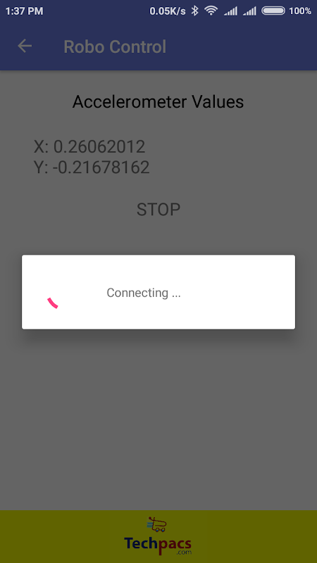 Robo Control Accelerometer reads phone's accelerometer values and sends commands to robot car accordingly to move forward, backward, left, right and stop.