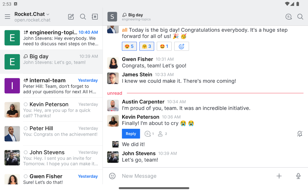 Rocket.Chatは、高水準のデータ保護を備えた組織向けのカスタマイズ可能なオープンソース通信プラットフォームです。これにより、Web、デスクトップ、またはモバイル上のデバイス間で、同僚間、他社、または顧客とのリアルタイムの会話が可能になります。