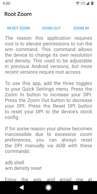 このアプリケーションにrootが必要な理由は、wmコマンドを実行するための権限を昇格させるためです。このコマンドにより、デバイスは独自の解像度と密度を変更できます。これは以前のAndroidバージョンでは調整可能でしたが、最近のバージョンではrootアクセスが必要です。