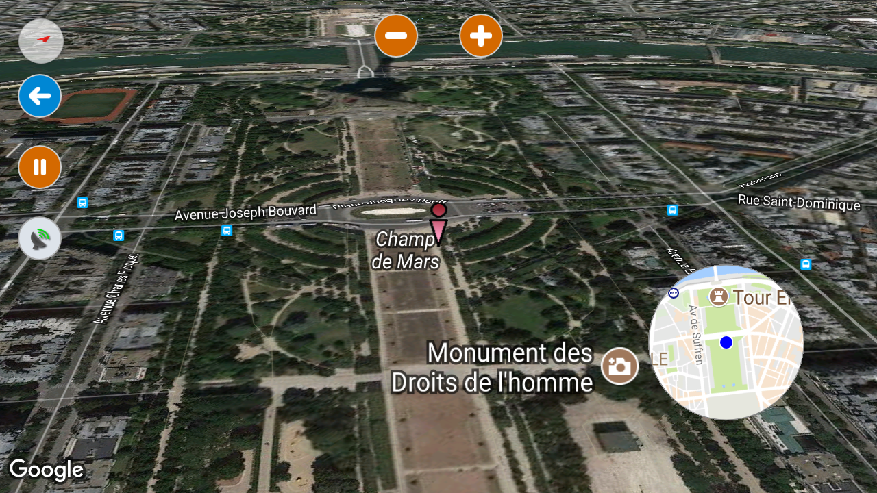 • 旅行シミュレーション: 開始地点を選択して、お使いの携帯電話を回転させて地図上のバーチャルな旅を開始します。