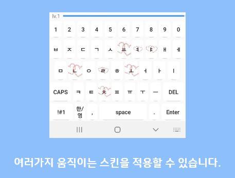 키보드를 사용할수록 경험치를 쌓아 키보드 레벨을 올릴 수 있고, 여러가지 액션을 가진 키보드 스킨을 스킬포인트를 통해 구매할 수 있습니다.