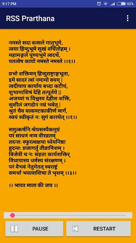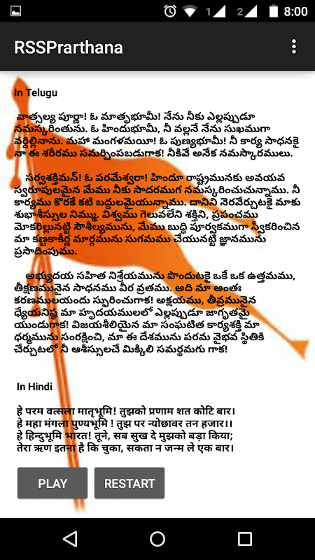 RSS Prarthanaは、swayamsvaksが目標を達成するための主な起源と強みです。これは、テルグ語、ヒンディー語、英語、マラヤーラム語、カンナダ語、バングラ語、タミル語、グジャラート語、グルウキ語、ベンガル語、オリヤー語の祈りのテキストを見て、RSS祈りを練習するために使用できるアプリです。サンスクリット語で書かれた3つのシュローカが含まれています。最初のシュローカはラシュトリヤの意味を伝え、2番目のシュローカはスワヤムセヴァクの意味を伝え、3番目のシュローカはその意味を伝えます。 サンの。このアプリは、最近RSS swayamsevaksに参加して、サンガプラタナとそのマニングを学ぶために使用できます。