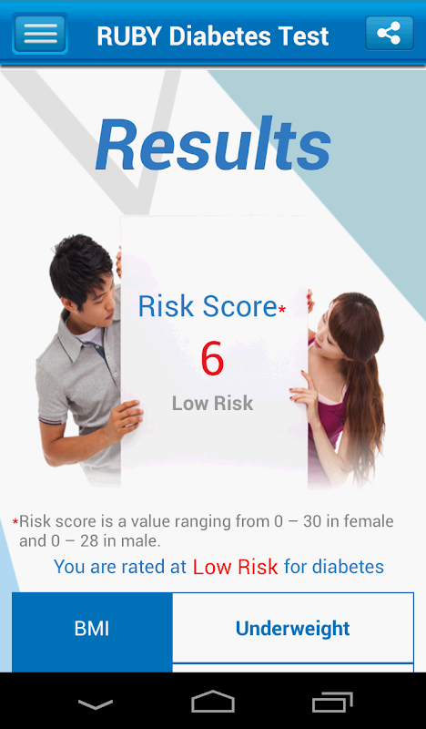 Risk score is a value ranging from 0 – 30 in female and 0 – 28 in male. If your risk score is 16 or above, it is advised that you visit your family doctor where you may need to undergo a more comprehensive test such as the oral glucose tolerance test (OGTT) or diabetes risk assessment.