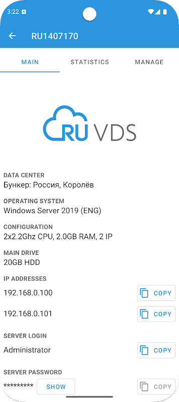 ruvds.com の仮想サーバー(VPS)を管理するためのモバイルアプリ。