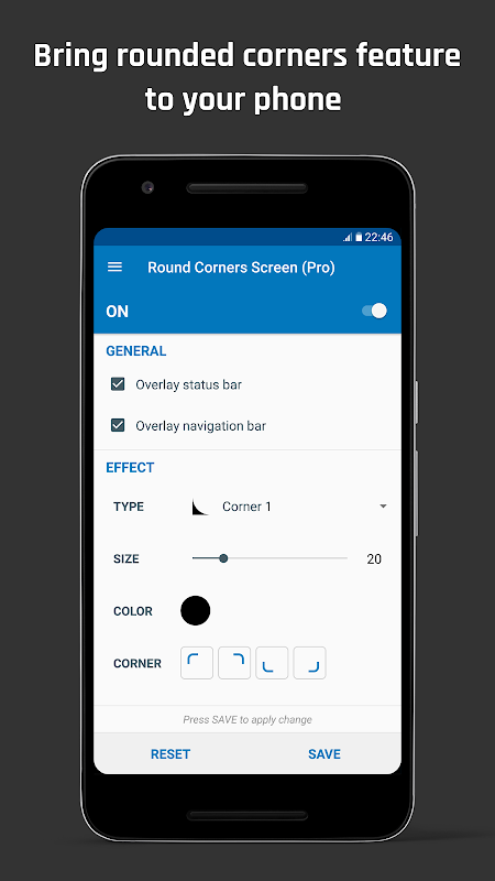 Rounded Corner allows you to feel the smooth look of curved screen and rounded corners like flagship phone LG G6 or Samsung Galaxy S8.