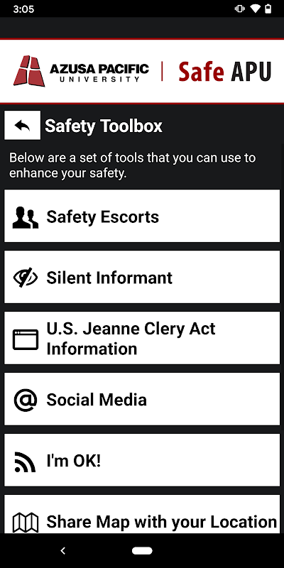Safe APUは、あずさ太平洋大学の公式安全アプリです。アズサパシフィック大学の安全およびセキュリティシステムと統合する唯一のアプリです。キャンパスセーフティは、アズサパシフィック大学キャンパスで学生、教職員、職員に安全性を提供するユニークなアプリの開発に取り組んできました。アプリはあなたに重要な安全警告を送信し、キャンパスの安全リソースへの即時アクセスを提供します。