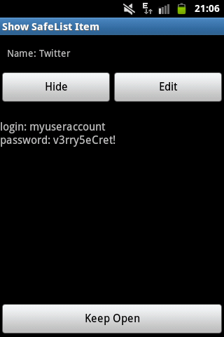 Application to keep a safe list of your information for privacy purposes. It uses the Android built-in encryption engine and does not use any network communiction to further help isolate your data.
