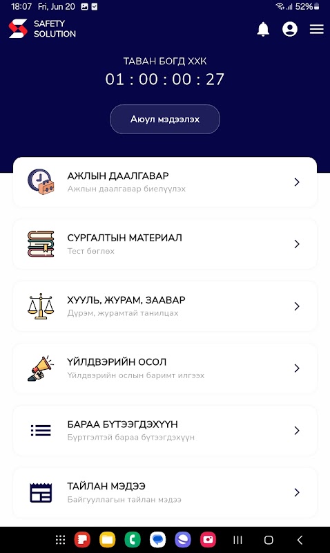 SafetySolution の安全性、安全性、安全性、安全性、安全性хогц сийдэл юм. Аппликейгон нь ажилтнуудын байр程лыг бодит цаг хугацаанд хянах, осол зерчлийг мэдээлэх, утутмын хяналт салгалт хийх, аюулын дохио илгээх зэрэг олон Ưйлдлийг нэг дор гсйцэтгэх боломжийг олгодог。