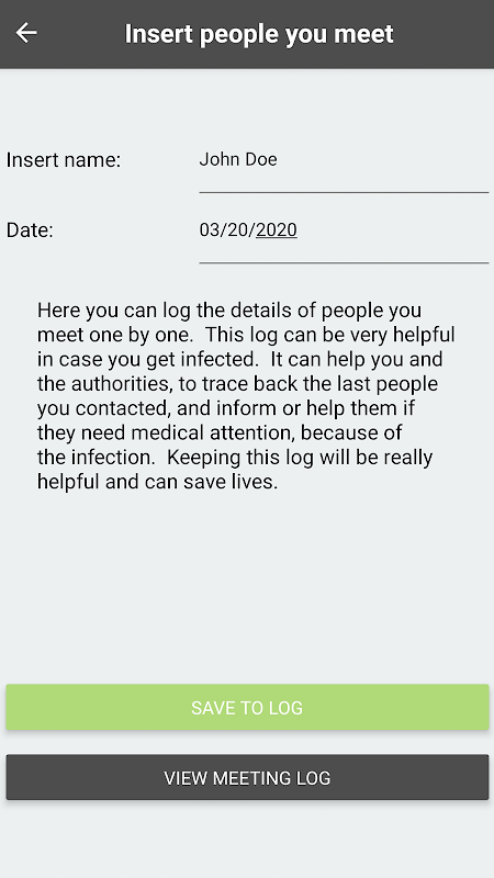 このアプリは、安全と他人を保護するためのヒントと救済策を確認するためのクイックガイドとして使用するように設計されています。また、病気の蔓延を防ぐために、最後に会った人全員を記録するログブックもあります。このように、出会った日付をすべての人に保存することは、感染症の場合にも役立ちます。これは、人命を救い、あなたと医療システムを支援できるシンプルなツールです。ここでは、公式のヘルスケアサービスが共有するヒントの簡単な概要も確認できます。