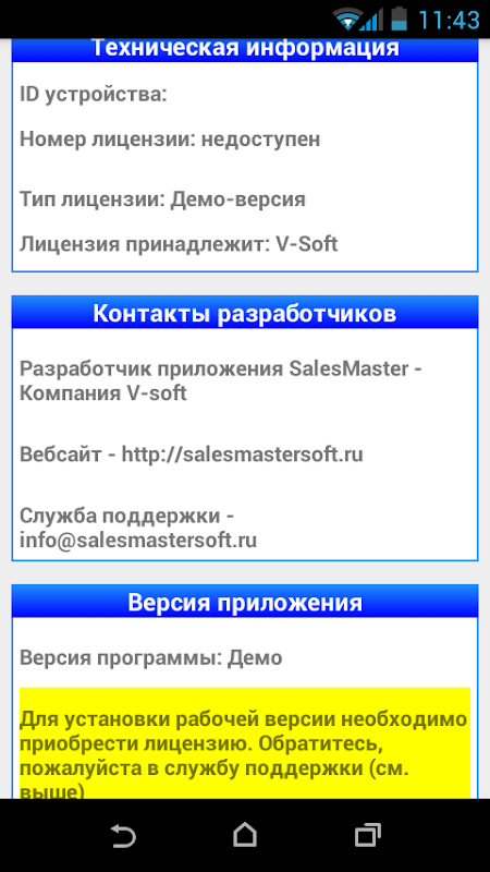 (Для полноценной работы в приложении, необходимо установить стандартную версию. В этом случае Вам понадобится номер лицензии, который Вы можете приобрести у компании-разработчика. На каждое устройство приобретается отдельная лицензия. Более подробную информацию можете узнать на сайте - http://salesmastersoft.ru )