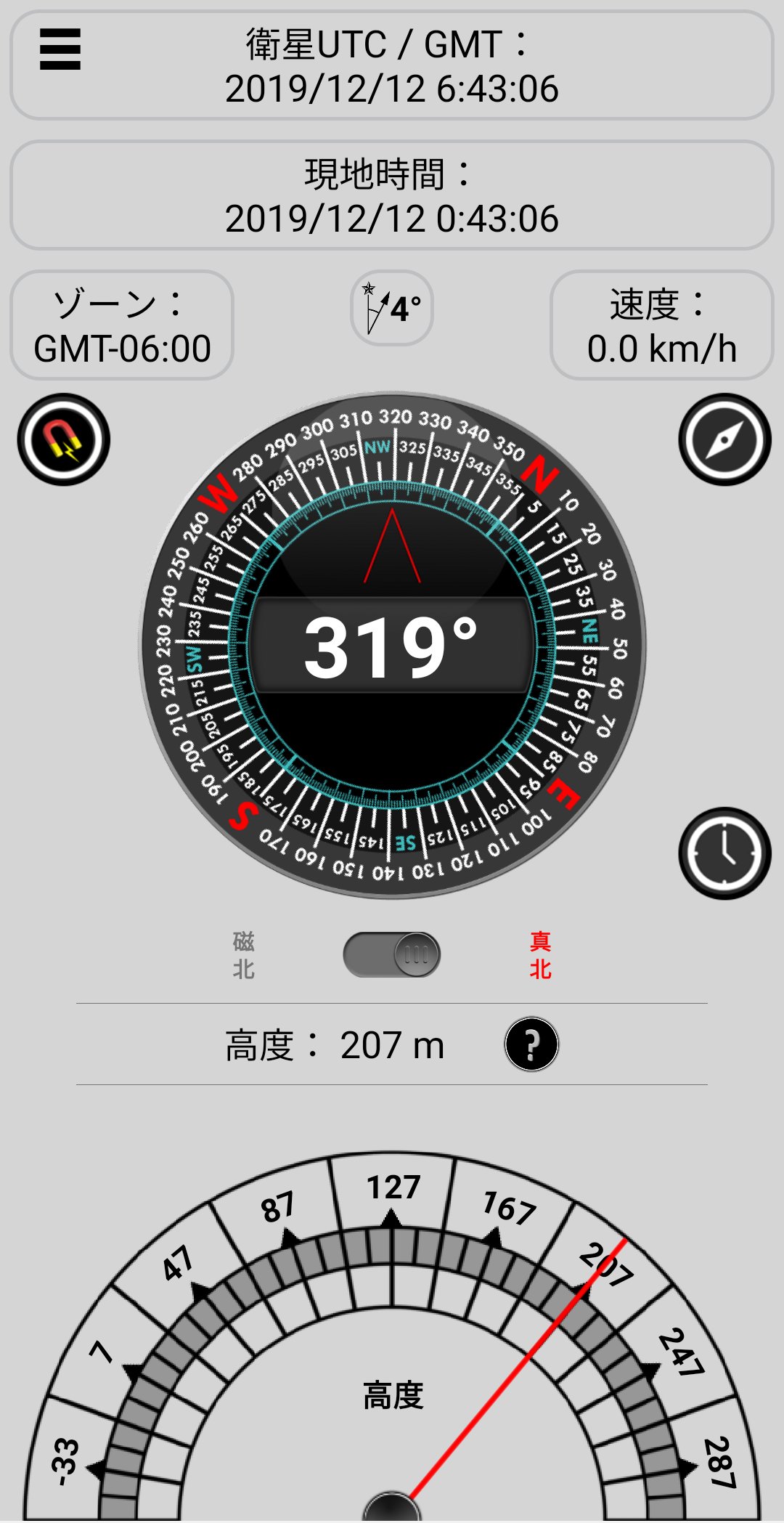 位置情報と衛星情報のレポートに加えて、アプリは、高度、目的地までの距離、住所、日の出、日没、月の満ち欠けなど、あらゆる種類の興味深い数値を計算します。あなたの位置と日付は、あなたの場所の磁気偏角を計算するために使用され、アプリケーションの磁気コンパスが磁北ではなく真北からの偏差を報告できるようにします。真北レポートコンパスは、好みに応じて、真の南北軸に沿って方向付けられたマップまたは真の南北軸から回転されたマップで非常にうまく機能します。