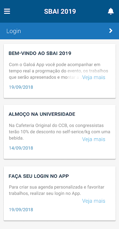 O aplicativo SBAI 2019 é gratuito e permite o acesso a todos os conteúdo do "14º Simpósio Brasileiro de Automação Inteligente", que acontecerá em Ouro Preto-MG durante os dias 27 a 30 de outubro de 2019.