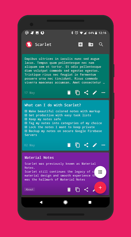 Scarlet (previously Material Notes) offers a simple no hassle interface for adding notes in a beautiful material design.