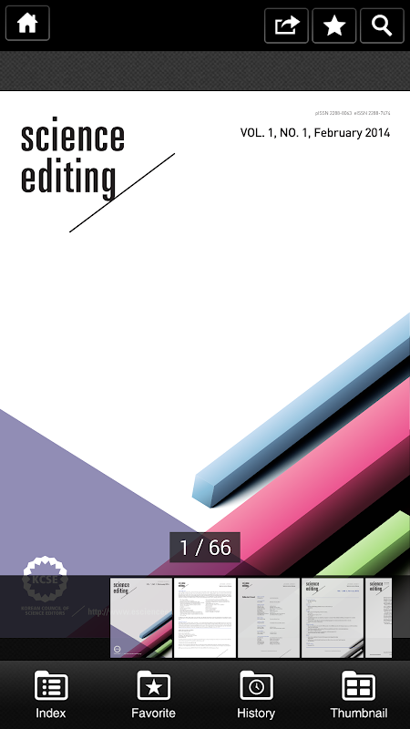 with volume 1 and number 1. It is to be published biannually. Supplement issues may be published. Total or a part of the articles in this journal are abstracted in ScienceCentral, Directory of Open Access Journal, Google Scholar, and CrossRef. Circulation number of print copies is 500 per issue. Full text is freely available from: http://www.escienceediting.org or http://e-se.org. It is the member journal of Council of Science Editors, the Association of Learned and Professional Society Publishers, and European Association of Science Editors. There is no page charge or article processing charge of author side. This journal is supported by the Korean Federation of Science and Technology Societies, the Government of the Republic of Korea (2013-2014).