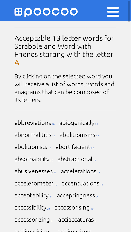 The dictionary contains 178,691 words that will allow you to win every game. We use TWL06 official dictionary. Our dictionary is a SCRABBLE and WORD WITH FRIENDS database that allows you to search for words from letters you have picked and check their meaning. It is also an anagram generator - a tool that allows you to create anagrams for Scrabble.