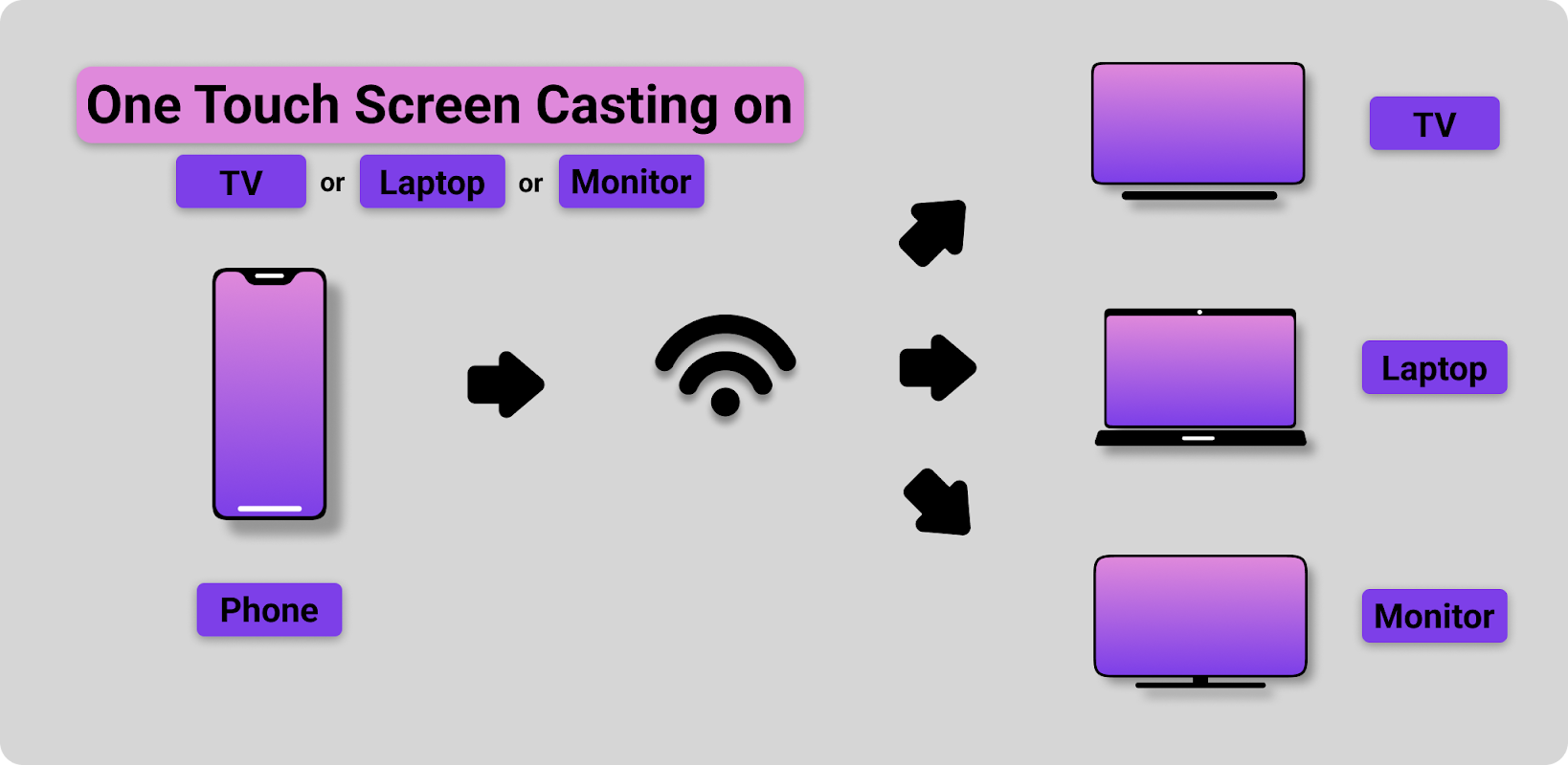 You can mirror your mobile phone screen on your TV, Laptop and Monitor with just one touch and watch your photos and videos on TV and Laptop screens.