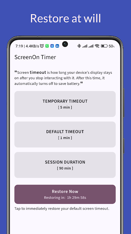 ScreenOn Timer が、そんな悩みを解決します。必要な時間だけ有効な一時的な画面タイムアウトを設定すると、アプリがその後、自動的に設定したタイムアウトに復元します。何かを見ているとき、読んでいるとき、プレゼンテーションをしているときなど、画面がすぐにオフになることがなくなり、後で設定を戻すのを忘れることもありません。