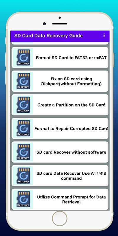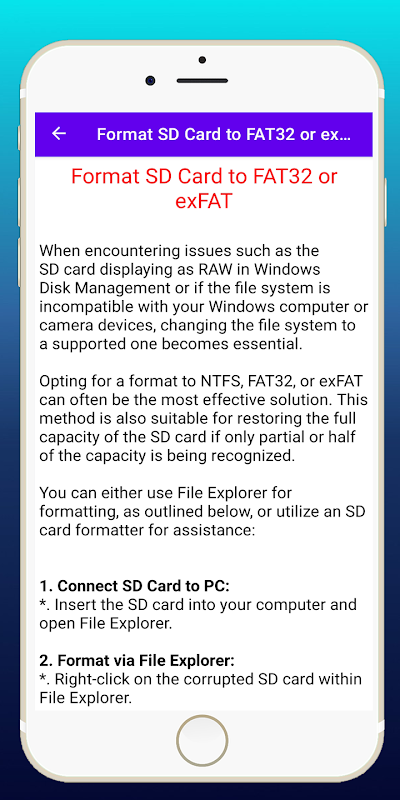 SDカードデータ復旧ガイドとSDカード修復ガイドの実行方法は、このアプリから利用できます。ソフトウェアなしでメモリカードを復元します。フォーマットせずに破損したSDカードを修復する方法。 SDカードがどのデバイスにも表示されない問題を修正する方法。破損したメモリカードの一般的な兆候と症状 ヒント。