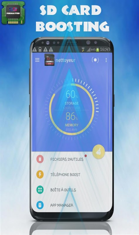 Sd card formatter Ram micro sd card Cleaner - Optimize is an android system tool which can clean useless application micro sd card micro sd card files ,it could save your phone disk space and make your phone speed up. One click ram clean micro sd card micro sd card and tf card.!