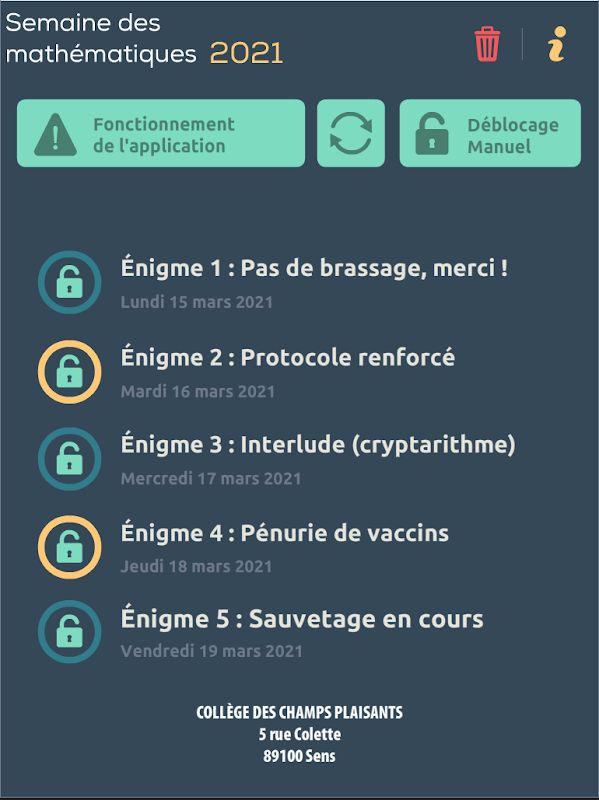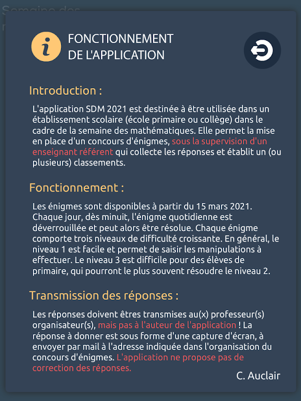 SDM 2021アプリケーションは、数学週間の一部として教育機関(小学校または大学)で使用することを目的としています。これにより、回答を収集して1つ(または複数)のランキングを確立する指示対象の教師の監督の下で、パズルコンテストを設定できます。