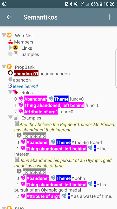 辞書のように使用できますが、このアプリは意味関係、語彙関係、意味的役割、意味的クラス、意味的フレームの探求に重点を置いています。