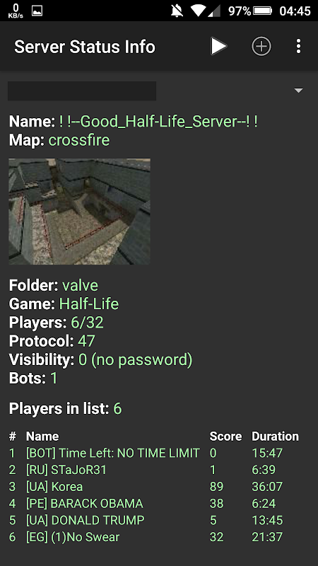 このプログラムを使用すると、簡単かつ迅速に見つけることができ、現在のサーバーがオンラインです。それは手元のコンピュータが存在しない場合に非常に必要です。アプリケーションは、トラフィックの最小量を消費しても、容易に非常に低速インターネットで、タスクに対処することができます。ゲームマップの画像がアプリケーションに保存されています。
