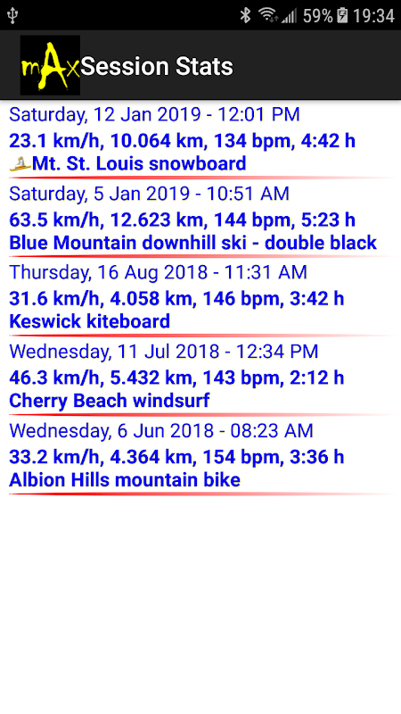 Gets max stats for your outdoor sports sessions (bike, ski, windsurfing, kiteboarding):