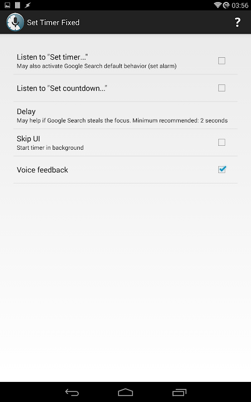 This app fixes the command "Set timer..." on Google Now. Instead of creating a new alarm, it starts a real timer.
