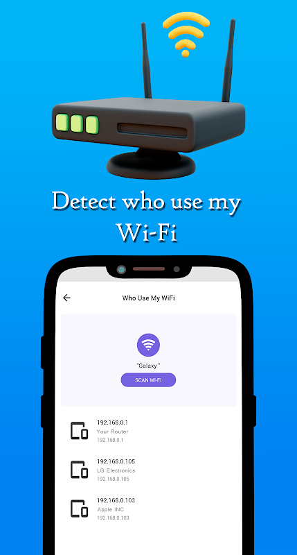 ワンタップでネットワーク速度を測定できます。 ping をミリ秒で表示し、ダウンロードとアップロードの速度を mbps で表示します。誰があなたのWiFiリストを使用しているかを表示します。これにより、接続されているすべてのデバイスのリストが表示されます。