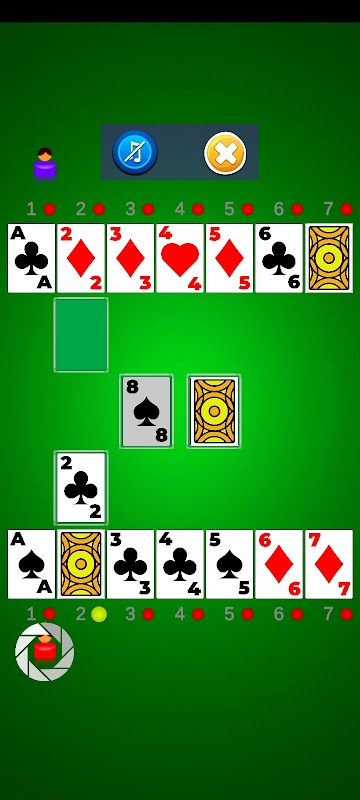 このゲームでは、両プレイヤーに52枚の標準デッキから7枚のカードが配られます。配られたカードは一列に並べ、残りのカードは中央に裏向きの山札として置きます。
