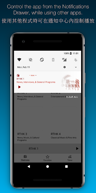 •毎時在鎖定及通知頁面控制電台的播放。於「我的最愛」簡易調台。