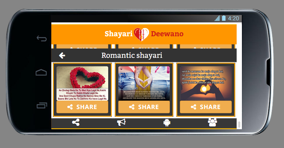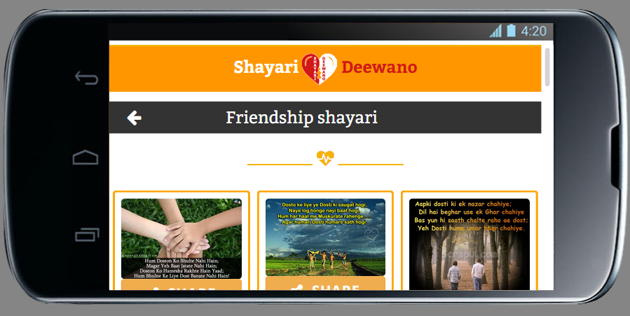 Shayari deewano app for sharing shayari photos. Shayari in all Indian Languages including Hindi, Urdu, Punjabi and Gujarati. Types of shayari romantic, sad, hindi, friendship, funny, attitude, etc. Share sharayi on social media. Romantic shayari for lovers, funny shayari for everyone, friendship shayari for friends, sad shayari for broken heart person. Share photos of shayari on social media...