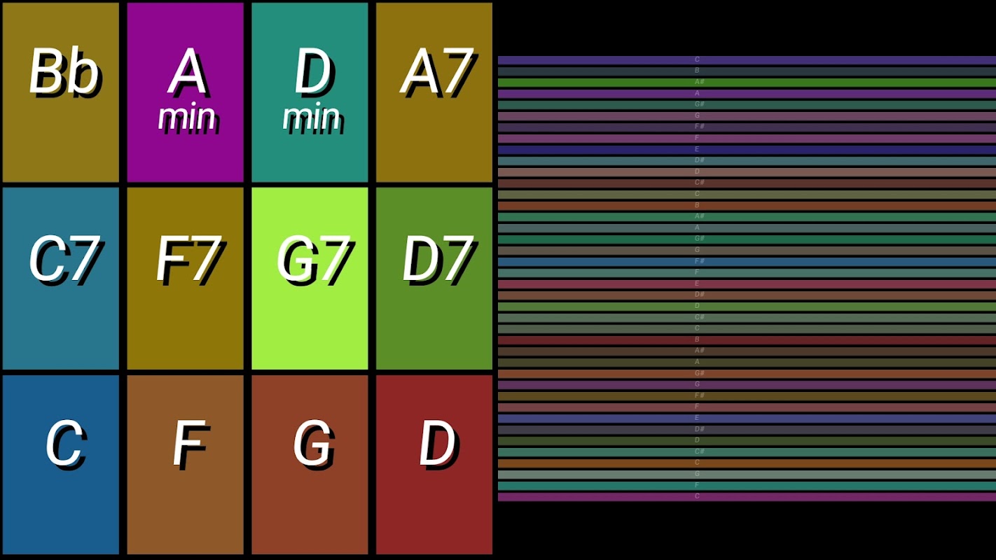 左側のコードボタンをタップするだけで、美しく調和のとれたコード進行を演奏できます。 2本の指を押してルート音、長7度/短7度、付加音などから選択するだけで簡単にコードを変更できます。