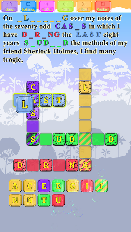 このゲームは、楽しくてカラフルなクロスワードパズルの膨大なコレクションで、書籍「シャーロック・ホームズの冒険」に登場するすべての物語を網羅しています。アーサー・コナン・ドイルの古典的かつ愛されている物語を、クロスワードパズルを解きながら再現する楽しい時間をお楽しみいただけます。本書は、フィクション界最高の探偵と称されるシャーロック・ホームズと親友のワトソン博士を描いた12の短編小説集です。お好きな時間に、すべての物語を存分にお楽しみいただけます。読むのは楽しいですが、時には少し退屈に感じることもあるでしょう。このゲームでは、クロスワードパズルを取り入れることで、読書体験を新鮮で魅力的なものにしています。読書中に脳を刺激し続けることができます。文章を考え、空欄を埋める必要があります。インタラクティブで魅力的な体験を通して、読んだ単語をただ受動的に繰り返すのではなく、単語の意味に集中することができます。