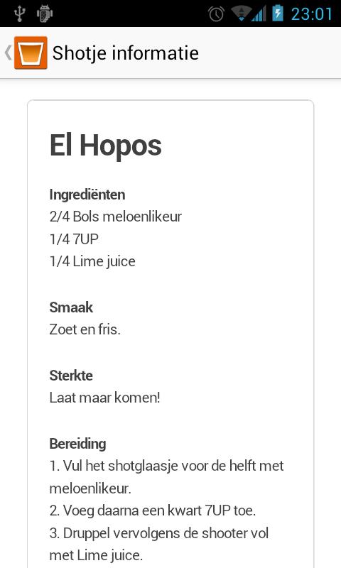 De shotjes.net app levert je alles op het gebied van shotjes. Wil je bijvoorbeeld weten hoe je een B52 maakt of wat voor dranken er in een Apenkopshooter gaan? Zoek je een lekker drankje voor tijdens een drankspelletje? Met de shotjes.net app kun je alle deze informatie gratis vinden, door een shotje te selecteren uit het overzicht, of via het selecteren van ingredienten.